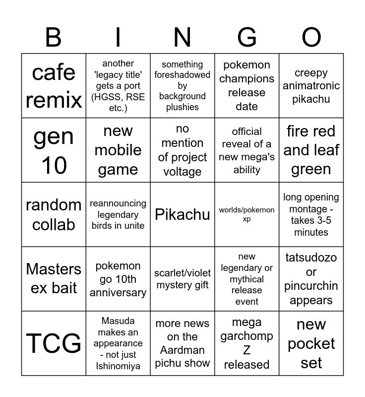 This bingo card has a free space and 24 words: pokemon go 10th anniversary, Masuda makes an appearance - not just Ishinomiya, no mention of project voltage, TCG, creepy animatronic pikachu, cafe remix, gen 10, another 'legacy title' gets a port (HGSS, RSE etc.), worlds/pokemon xp, scarlet/violet mystery gift, official reveal of a new mega's ability, random collab, new legendary or mythical release event, tatsudozo or pincurchin appears, new mobile game, mega garchomp Z released, long opening montage - takes 3-5 minutes, something foreshadowed by background plushies, fire red and leaf green, reannouncing legendary birds in unite, new pocket set, Masters ex bait, pokemon champions release date and more news on the Aardman pichu show.