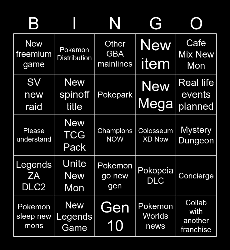 This bingo card has a free space and 24 words: Unite New Mon, New Legends Game, Pokepark, Pokemon sleep new mons, Cafe Mix New Mon, New freemium game, SV new raid, Pokemon Distribution, Colosseum XD Now, Pokemon go new gen, New Mega, Please understand, Pokopeia DLC, Concierge, New spinoff title, Pokemon Worlds news, Mystery Dungeon, Other GBA mainlines, Real life events planned, New TCG Pack, Collab with another franchise, Legends ZA DLC2, New item and Gen 10.