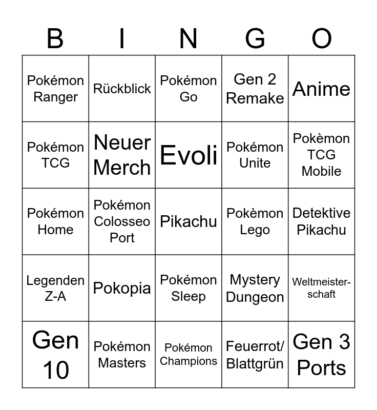 This bingo card has a free space and 24 words: Pokopia, Pokémon Masters, Evoli, Gen 10, Anime, Pokémon Ranger, Pokémon TCG, Rückblick, Pokèmon Lego, Pokémon Sleep, Pokémon Unite, Pokémon Home, Mystery Dungeon, Weltmeister-schaft, Neuer Merch, Feuerrot/ Blattgrün, Detektive Pikachu, Pokémon Go, Pokèmon TCG Mobile, Pokémon Colosseo Port, Gen 3 Ports, Legenden Z-A, Gen 2 Remake and Pokémon Champions.