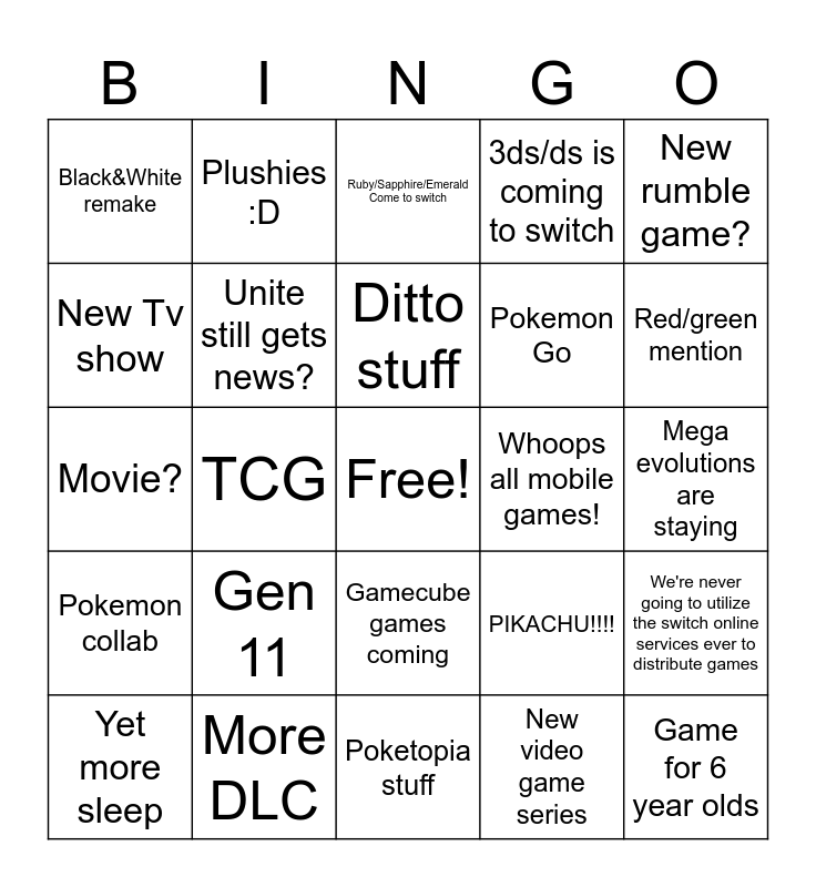 This bingo card has a free space and 24 words: Gen 11, More DLC, Ditto stuff, Yet more sleep, New rumble game?, Black&White remake, New Tv show, Plushies :D, Whoops all mobile games!, Gamecube games coming, Pokemon Go, Movie?, PIKACHU!!!!, We're never going to utilize the switch online services ever to distribute games, Unite still gets news?, New video game series, Mega evolutions are staying, Ruby/Sapphire/Emerald Come to switch, Red/green mention, TCG, Game for 6 year olds, Pokemon collab, 3ds/ds is coming to switch and Poketopia stuff.