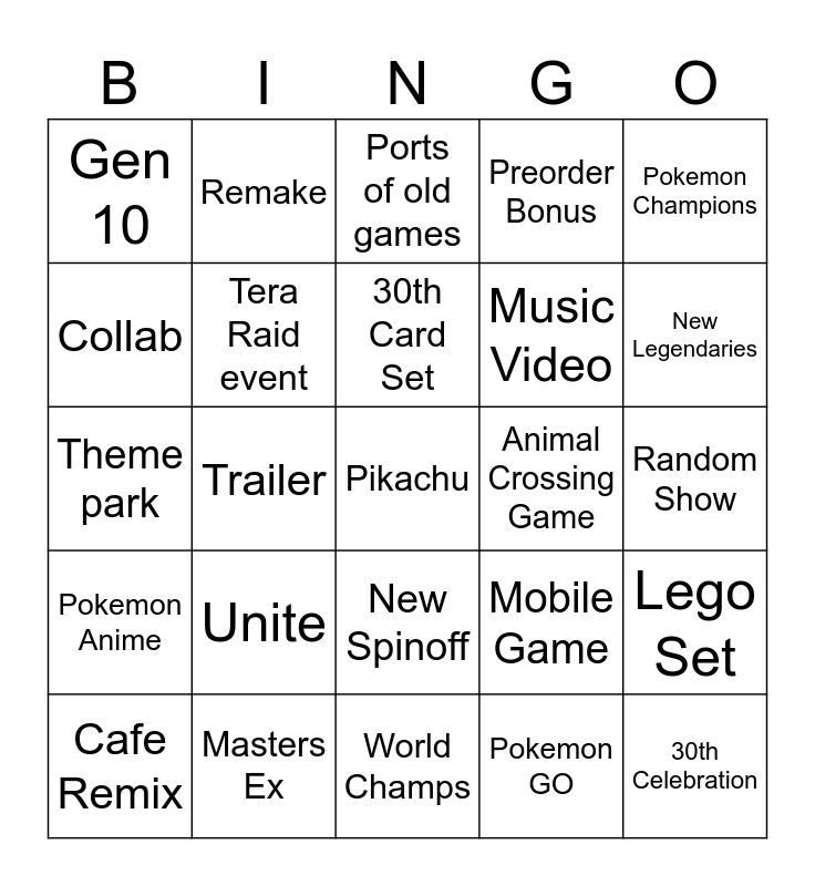 This bingo card has a free space and 24 words: Cafe Remix, Unite, 30th Card Set, Pokemon GO, Pokemon Champions, Gen 10, Remake, Ports of old games, Animal Crossing Game, Random Show, Theme park, Tera Raid event, Mobile Game, Lego Set, Collab, Masters Ex, World Champs, Preorder Bonus, New Legendaries, Pokemon Anime, Trailer, New Spinoff, Music Video and 30th Celebration.