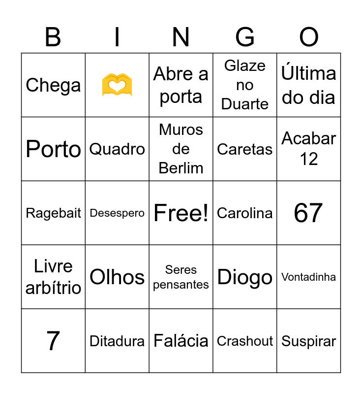 This bingo card has a free space and 31 words: Falácia, Juízo de Valor, Desespero, Romances da stora, Chega, Abre a porta, Quadro, Diogo, Carolina, Crashout, 67, Suspirar, Mãos no cabelo, Mbappe, Acabar 12, Sanidade mental, Vontadinha, Olhos, Livre arbítrio, Seres pensantes, Última do dia, Cartoon, 7, 🫶, Caretas, Porto, Glaze no Duarte, Ragebait, Ditadura, Muros de Berlim and Vozes.