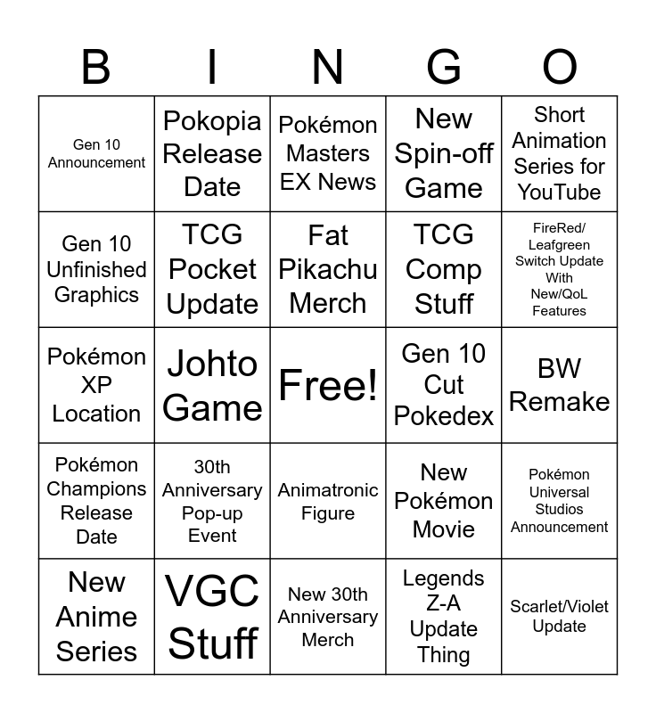 This bingo card has a free space and 24 words: 30th Anniversary Pop-up Event, VGC Stuff, Fat Pikachu Merch, New Anime Series, Short Animation Series for YouTube, Gen 10 Announcement, Gen 10 Unfinished Graphics, Pokopia Release Date, Gen 10 Cut Pokedex, Animatronic Figure, TCG Comp Stuff, Pokémon XP Location, New Pokémon Movie, Pokémon Universal Studios Announcement, TCG Pocket Update, Legends Z-A Update Thing, BW Remake, Pokémon Masters EX News, FireRed/ Leafgreen Switch Update With New/QoL Features, Johto Game, Scarlet/Violet Update, Pokémon Champions Release Date, New Spin-off Game and New 30th Anniversary Merch.