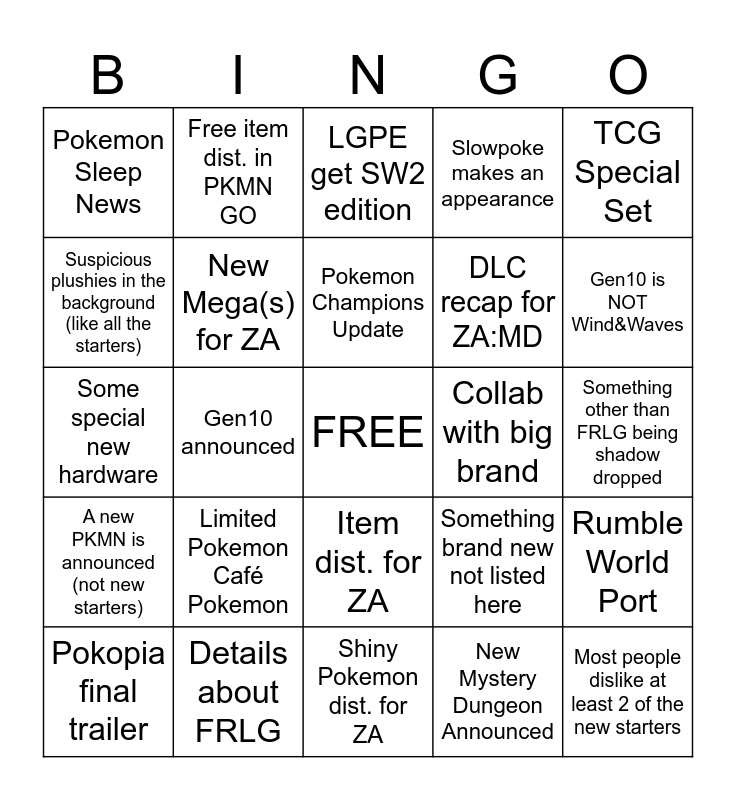 This bingo card has a free space and 24 words: Limited Pokemon Café Pokemon, Details about FRLG, Pokemon Champions Update, Pokopia final trailer, TCG Special Set, Pokemon Sleep News, Suspicious plushies in the background (like all the starters), Free item dist. in PKMN GO, Collab with big brand, Item dist. for ZA, DLC recap for ZA:MD, Some special new hardware, Something brand new not listed here, Rumble World Port, New Mega(s) for ZA, New Mystery Dungeon Announced, Something other than FRLG being shadow dropped, LGPE get SW2 edition, Gen10 is NOT Wind&Waves, Gen10 announced, Most people dislike at least 2 of the new starters, A new PKMN is announced (not new starters), Slowpoke makes an appearance and Shiny Pokemon dist. for ZA.