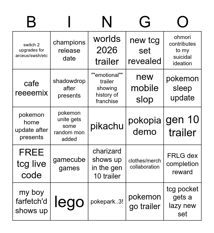 This bingo card has a free space and 24 words: gamecube games, lego, ""emotional"" trailer showing history of franchise, my boy farfetch'd shows up, ohmori contributes to my suicidal ideation, switch 2 upgrades for arceus/swsh/etc, cafe reeeemix, champions release date, pokopia demo, charizard shows up in the gen 10 trailer, new mobile slop, pokemon home update after presents, clothes/merch collaboration, FRLG dex completion reward, shadowdrop after presents, pokemon go trailer, gen 10 trailer, worlds 2026 trailer, pokemon sleep update, pokemon unite gets some random mon added, tcg pocket gets a lazy new set, FREE tcg live code, new tcg set revealed and pokepark..3!.