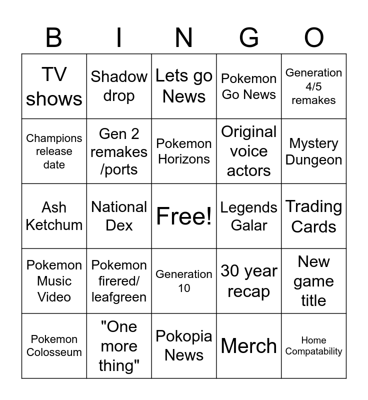 This bingo card has a free space and 24 words: Pokemon firered/ leafgreen, "One more thing", Pokemon Horizons, Pokemon Colosseum, Generation 4/5 remakes, TV shows, Champions release date, Shadow drop, Legends Galar, Generation 10, Original voice actors, Ash Ketchum, 30 year recap, New game title, Gen 2 remakes /ports, Merch, Trading Cards, Lets go News, Mystery Dungeon, National Dex, Home Compatability, Pokemon Music Video, Pokemon Go News and Pokopia News.