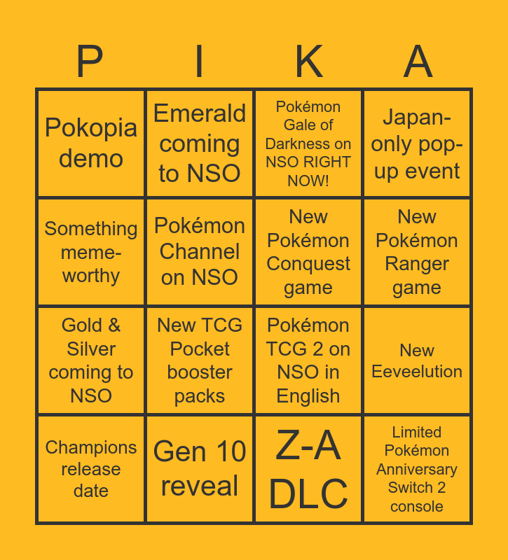 This bingo card has 16 words: Gen 10 reveal, New Eeveelution, Pokémon Gale of Darkness on NSO RIGHT NOW!, Pokopia demo, Gold & Silver coming to NSO, Emerald coming to NSO, Pokémon TCG 2 on NSO in English, Z-A DLC, Something meme-worthy, Pokémon Channel on NSO, Champions release date, Japan-only pop-up event, New TCG Pocket booster packs, New Pokémon Ranger game, New Pokémon Conquest game and Limited Pokémon Anniversary Switch 2 console.