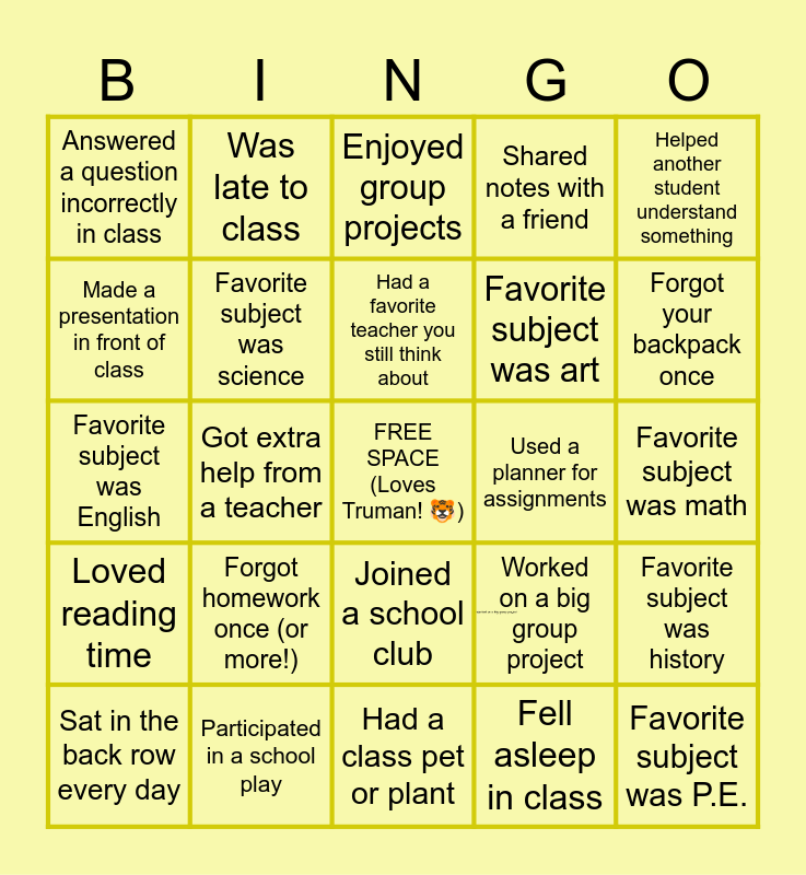 This bingo card has 1 images, a free space and 24 words: Sat in the back row every day, Forgot homework once (or more!), Had a favorite teacher you still think about, Fell asleep in class, Helped another student understand something, Answered a question incorrectly in class, Was late to class, Enjoyed group projects, Used a planner for assignments, Favorite subject was math, Favorite subject was English, Favorite subject was science, Worked on a big group project, Favorite subject was history, Made a presentation in front of class, Participated in a school play, Had a class pet or plant, Shared notes with a friend, Forgot your backpack once, Loved reading time, Got extra help from a teacher, Joined a school club, Favorite subject was art and Favorite subject was P.E..
