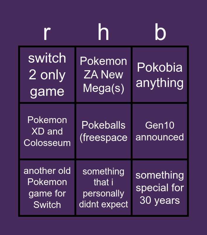 This bingo card has a free space and 8 words: Gen10 announced, Pokobia anything, Pokemon ZA New Mega(s), another old Pokemon game for Switch, switch 2 only game, something special for 30 years, Pokemon XD and Colosseum and something that i personally didnt expect.
