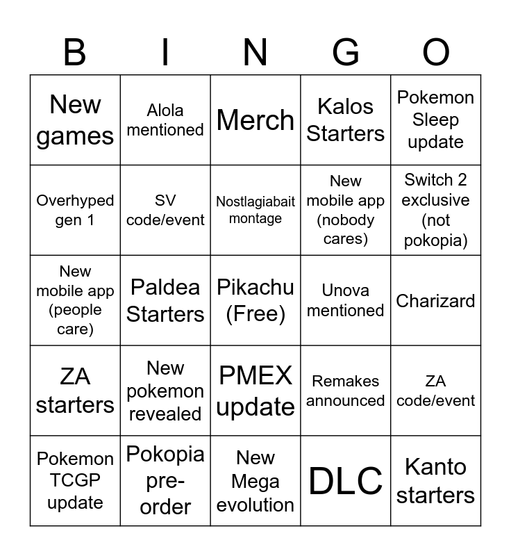 This bingo card has a free space and 24 words: New pokemon revealed, Pokopia pre-order, Nostlagiabait montage, Pokemon TCGP update, Pokemon Sleep update, New games, Overhyped gen 1, Alola mentioned, Unova mentioned, PMEX update, New mobile app (nobody cares), New mobile app (people care), Remakes announced, ZA code/event, SV code/event, DLC, Charizard, Merch, Switch 2 exclusive (not pokopia), Paldea Starters, Kanto starters, ZA starters, Kalos Starters and New Mega evolution.