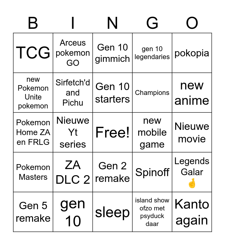 This bingo card has a free space and 24 words: ZA DLC 2, gen 10, Gen 10 starters, Gen 5 remake, pokopia, TCG, new Pokemon Unite pokemon, Arceus pokemon GO, new mobile game, Gen 2 remake, Champions, Pokemon Home ZA en FRLG, Spinoff, Legends Galar 🤞, Sirfetch'd and Pichu, island show ofzo met psyduck daar, Nieuwe movie, Gen 10 gimmich, new anime, Nieuwe Yt series, Kanto again, Pokemon Masters, gen 10 legendaries and sleep.