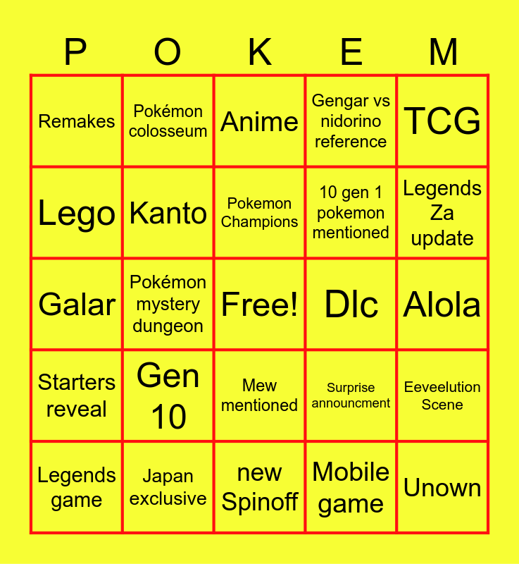 This bingo card has a free space and 24 words: Legends game, Gen 10, Pokemon Champions, Mobile game, TCG, Remakes, Pokémon colosseum, Anime, Dlc, Alola, Galar, Kanto, Surprise announcment, Eeveelution Scene, Lego, Japan exclusive, new Spinoff, Gengar vs nidorino reference, Legends Za update, Starters reveal, Pokémon mystery dungeon, Mew mentioned, 10 gen 1 pokemon mentioned and Unown.