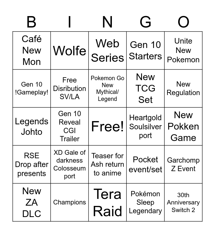 This bingo card has a free space and 24 words: XD Gale of darkness Colosseum port, Champions, Pokemon Go New Mythical/ Legend, New ZA DLC, Unite New Pokemon, Café New Mon, Gen 10 !Gameplay!, Wolfe, Heartgold Soulsilver port, Teaser for Ash return to anime, New TCG Set, Legends Johto, Pocket event/set, Garchomp Z Event, Free Disribution SV/LA, Pokémon Sleep Legendary, New Pokken Game, Web Series, New Regulation, Gen 10 Reveal CGI Trailer, 30th Anniversary Switch 2, RSE Drop after presents, Gen 10 Starters and Tera Raid.