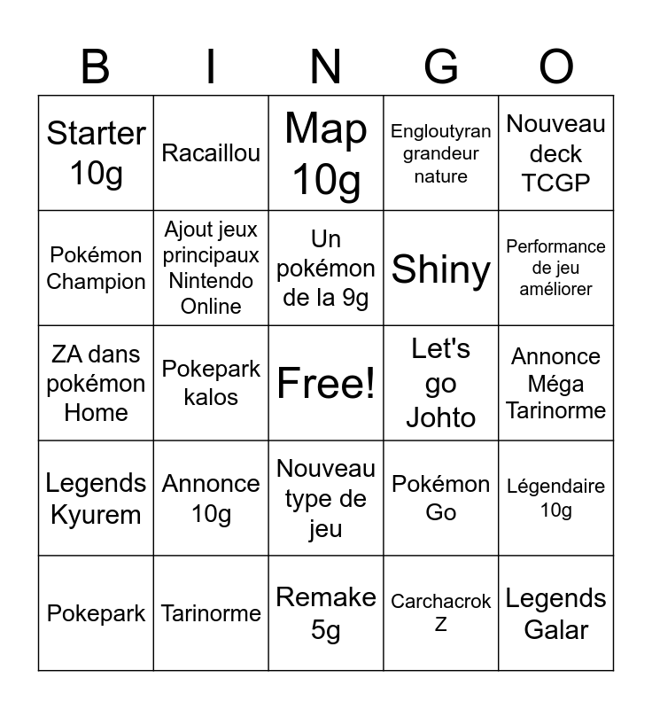This bingo card has a free space and 24 words: Annonce 10g, Tarinorme, Un pokémon de la 9g, Pokepark, Nouveau deck TCGP, Starter 10g, Pokémon Champion, Racaillou, Let's go Johto, Nouveau type de jeu, Shiny, ZA dans pokémon Home, Pokémon Go, Légendaire 10g, Ajout jeux principaux Nintendo Online, Carchacrok Z, Annonce Méga Tarinorme, Map 10g, Performance de jeu améliorer, Pokepark kalos, Legends Galar, Legends Kyurem, Engloutyran grandeur nature and Remake 5g.