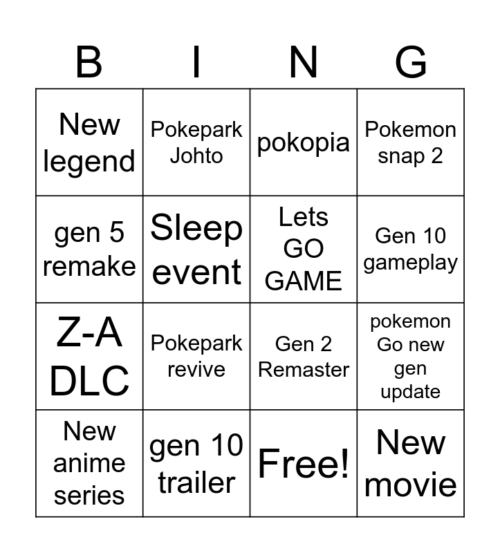 This bingo card has 16 words: gen 10 trailer, pokemon Go new gen update, pokopia, New legend, Z-A DLC, Pokepark Johto, Gen 2 Remaster, Free!, gen 5 remake, Sleep event, New anime series, Pokemon snap 2, Pokepark revive, Gen 10 gameplay, Lets GO GAME and New movie.