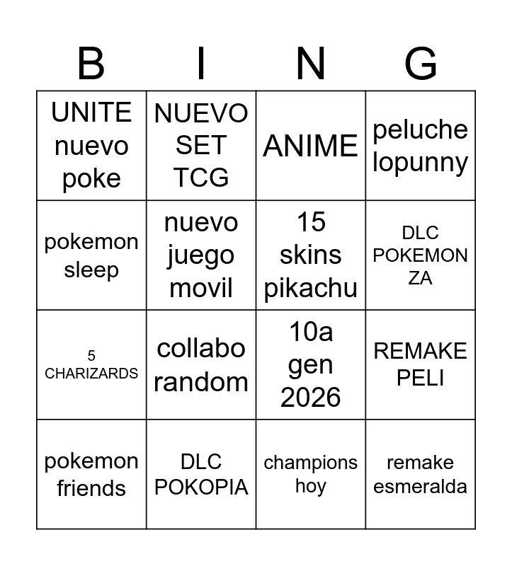 This bingo card has 16 words: DLC POKOPIA, REMAKE PELI, ANIME, UNITE nuevo poke, 5 CHARIZARDS, NUEVO SET TCG, 10a gen 2026, champions hoy, pokemon sleep, nuevo juego movil, pokemon friends, peluche lopunny, collabo random, DLC POKEMON ZA, 15 skins pikachu and remake esmeralda.