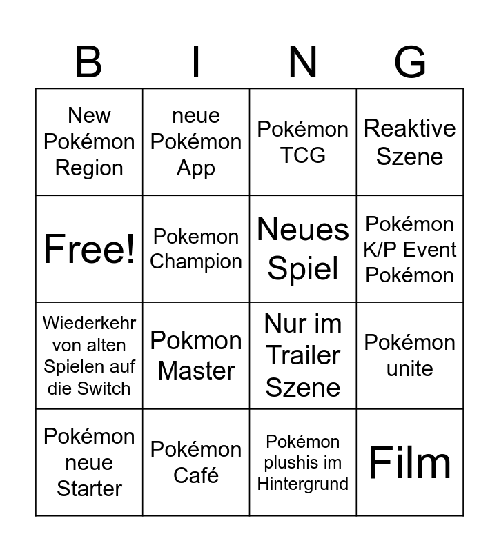 This bingo card has 16 words: Pokémon Café, Pokémon unite, Pokémon TCG, New Pokémon Region, Wiederkehr von alten Spielen auf die Switch, neue Pokémon App, Nur im Trailer Szene, Pokémon plushis im Hintergrund, Free!, Pokemon Champion, Pokémon neue Starter, Reaktive Szene, Pokmon Master, Pokémon K/P Event Pokémon, Neues Spiel and Film.