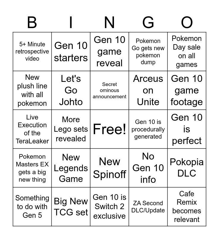 This bingo card has a free space and 24 words: New Legends Game, Big New TCG set, Secret ominous announcement, Something to do with Gen 5, Pokemon Day sale on all games, 5+ Minute retrospective video, New plush line with all pokemon, Gen 10 starters, Gen 10 is procedurally generated, New Spinoff, Arceus on Unite, Live Execution of the TeraLeaker, No Gen 10 info, Pokopia DLC, Let's Go Johto, ZA Second DLC/Update, Gen 10 is perfect, Gen 10 game reveal, Gen 10 game footage, More Lego sets revealed, Cafe Remix becomes relevant, Pokemon Masters EX gets a big new thing, Pokemon Go gets new pokemon dump and Gen 10 is Switch 2 exclusive.