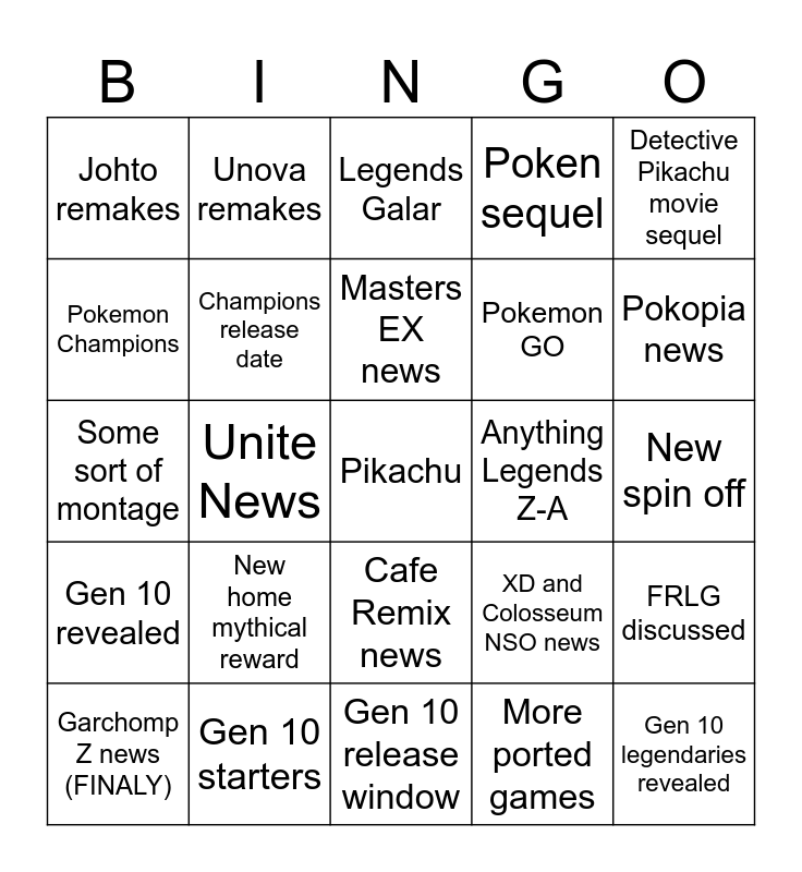 This bingo card has a free space and 25 words: Gen 10 revealed, Gen 10 starters, Gen 10 release window, More ported games, Detective Pikachu movie sequel, Johto remakes, Unova remakes, Legends Galar, Anything Legends Z-A, FRLG discussed, Pokemon Champions, Champions release date, New Mystery Dungeon game, XD and Colosseum NSO news, Pokopia news, Garchomp Z news (FINALY), Unite News, Masters EX news, Pokemon GO, New spin off, Some sort of montage, New home mythical reward, Cafe Remix news, Poken sequel and Gen 10 legendaries revealed.