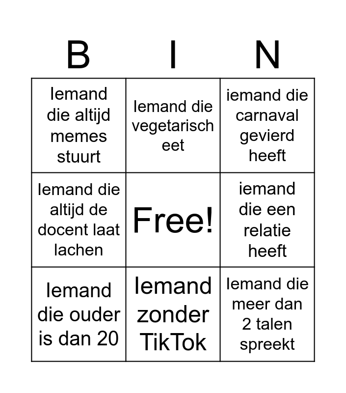 This bingo card has a free space and 32 words: Iemand die mee doet aan de ramadan, Iemand die minder dan 10 minuten moet rijden na school, iemand die zijn eigen auto heeft, iemand waarvan zijn lievelingseten Mexicaans is, iemand die graag naar reality-tv kijkt, Iemand die ouder is dan 20, Iemand die meer dan 2 talen spreekt, Iemand die met het OV komt, Iemand die vegetarisch eet, Iemand die tattoos heeft, Iemand zonder TikTok, iemand die carnaval gevierd heeft, iemand die ooit op televisie is geweest, iemand die zijn vakantie al geboekt heeft, Iemand die bezig is met rijlessen, iemand die op zichzelf woont, iemand die graag gamed, Iemand die van pittig eten houdt, iemand met een hond, iemand die k-pop leuk vind, iemand die verslaafd is aan schoenen, iemand met een grote familie, iemand die goed kan Dansen, Iemand die een pet of hoed draagt, Iemand die vaak koffie/energydrink nodig heeft tijdens school, Iemand die altijd de docent laat lachen, Iemand die liever een presentatie doet dan een toets maakt, iemand die een relatie heeft, Iemand die altijd memes stuurt, Iemand die naar festivals wil dit jaar, iemand die een instrument kan spelen and iemand met een leuke kledingstijl.