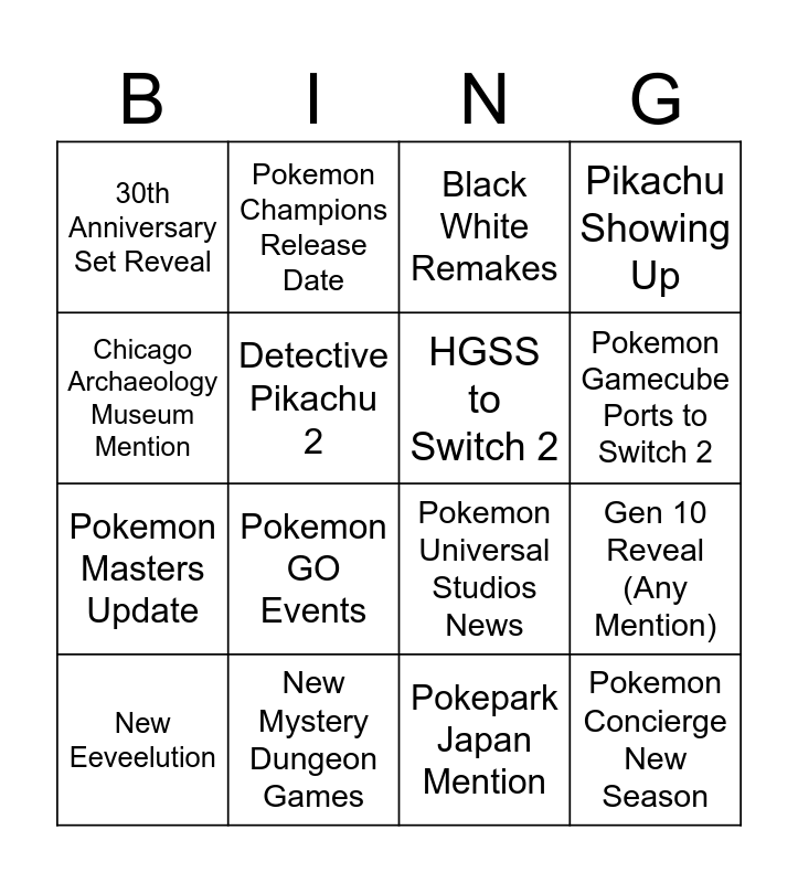 This bingo card has 16 words: New Mystery Dungeon Games, Gen 10 Reveal (Any Mention), Black White Remakes, 30th Anniversary Set Reveal, Pokemon Masters Update, Pokemon Champions Release Date, Pokemon Universal Studios News, Pokepark Japan Mention, Chicago Archaeology Museum Mention, Detective Pikachu 2, New Eeveelution, Pikachu Showing Up, Pokemon GO Events, Pokemon Gamecube Ports to Switch 2, HGSS to Switch 2 and Pokemon Concierge New Season.