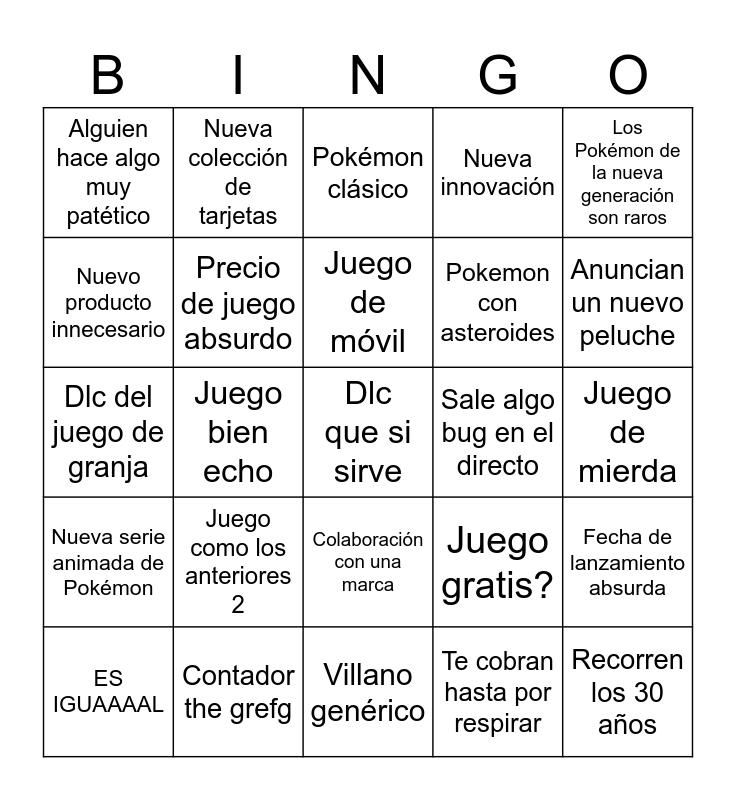 This bingo card has a free space and 24 words: Juego como los anteriores 2, Contador the grefg, Juego de móvil, ES IGUAAAAL, Los Pokémon de la nueva generación son raros, Alguien hace algo muy patético, Nuevo producto innecesario, Nueva colección de tarjetas, Sale algo bug en el directo, Colaboración con una marca, Pokemon con asteroides, Dlc del juego de granja, Juego gratis?, Fecha de lanzamiento absurda, Precio de juego absurdo, Te cobran hasta por respirar, Juego de mierda, Pokémon clásico, Anuncian un nuevo peluche, Juego bien echo, Recorren los 30 años, Nueva serie animada de Pokémon, Nueva innovación and Villano genérico.