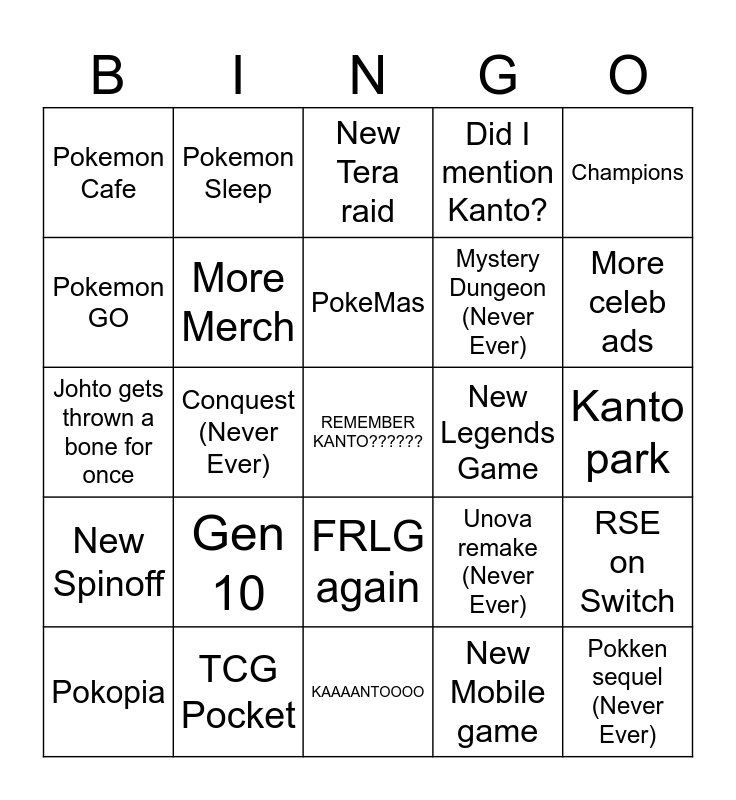 This bingo card has a free space and 24 words: Gen 10, TCG Pocket, PokeMas, Pokopia, Champions, Pokemon Cafe, Pokemon GO, Pokemon Sleep, New Legends Game, FRLG again, Mystery Dungeon (Never Ever), Johto gets thrown a bone for once, Unova remake (Never Ever), RSE on Switch, More Merch, New Mobile game, Kanto park, New Tera raid, More celeb ads, Conquest (Never Ever), Pokken sequel (Never Ever), New Spinoff, Did I mention Kanto? and KAAAANTOOOO.