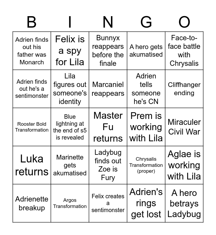 This bingo card has 25 words: Marinette gets akumatised, Felix creates a sentimonster, Marcaniel reappears, Adrienette breakup, Face-to-face battle with Chrysalis, Adrien finds out his father was Monarch, Adrien finds out he's a sentimonster, Felix is a spy for Lila, Prem is working with Lila, Ladybug finds out Zoe is Fury, Adrien tells someone he's CN, Rooster Bold Transformation, Chrysalis Transformation (proper), Aglae is working with Lila, Lila figures out someone's identity, A hero betrays Ladybug, Miraculer Civil War, Bunnyx reappears before the finale, Cliffhanger ending, Blue lightning at the end of s5 is revealed, Master Fu returns, Argos Transformation, Luka returns, A hero gets akumatised and Adrien's rings get lost.
