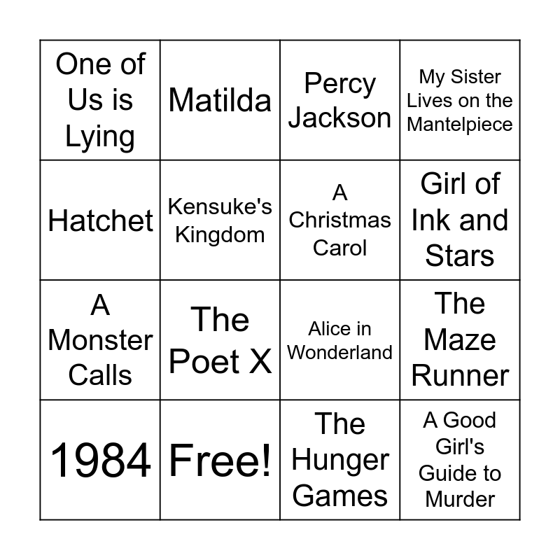 This bingo card has 21 words: Free!, Harry Potter, Matilda, Diary of a Wimpy Kid, The Hunger Games, A Christmas Carol, One of Us is Lying, Percy Jackson, Alice in Wonderland, Girl of Ink and Stars, A Monster Calls, My Sister Lives on the Mantelpiece, A Good Girl's Guide to Murder, The Book Thief, Kensuke's Kingdom, Wonder, 1984, The Poet X, Hatchet, The Maze Runner and The Perks of Being a Wallflower.