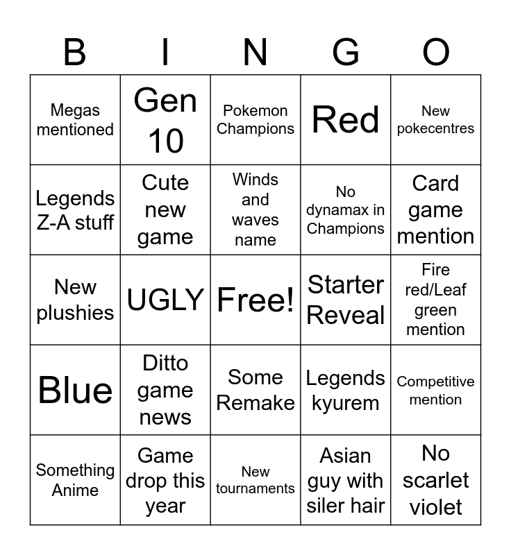 This bingo card has a free space and 24 words: Ditto game news, Game drop this year, Winds and waves name, Something Anime, New pokecentres, Megas mentioned, Legends Z-A stuff, Gen 10, Starter Reveal, Some Remake, No dynamax in Champions, New plushies, Legends kyurem, Competitive mention, Cute new game, Asian guy with siler hair, Fire red/Leaf green mention, Pokemon Champions, Card game mention, UGLY, No scarlet violet, Blue, Red and New tournaments.