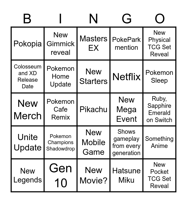 This bingo card has a free space and 24 words: Pokemon Champions Shadowdrop, Gen 10, New Starters, New Legends, New Physical TCG Set Reveal, Pokopia, Colosseum and XD Release Date, New Gimmick reveal, New Mega Event, New Mobile Game, Netflix, New Merch, Shows gameplay from every generation, Something Anime, Pokemon Home Update, Hatsune Miku, Ruby, Sapphire Emerald on Switch, Masters EX, Pokemon Sleep, Pokemon Cafe Remix, New Pocket TCG Set Reveal, Unite Update, PokePark mention and New Movie?.