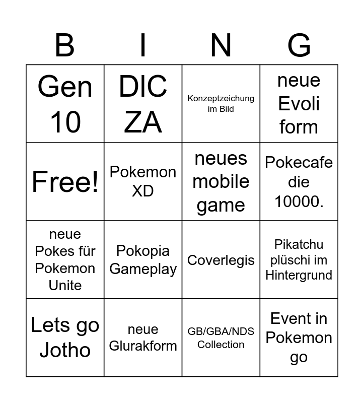 This bingo card has 16 words: neue Glurakform, Pikatchu plüschi im Hintergrund, Konzeptzeichung im Bild, Gen 10, neue Pokes für Pokemon Unite, DlC ZA, Coverlegis, GB/GBA/NDS Collection, Free!, Pokemon XD, Lets go Jotho, neue Evoli form, Pokopia Gameplay, Pokecafe die 10000., neues mobile game and Event in Pokemon go.