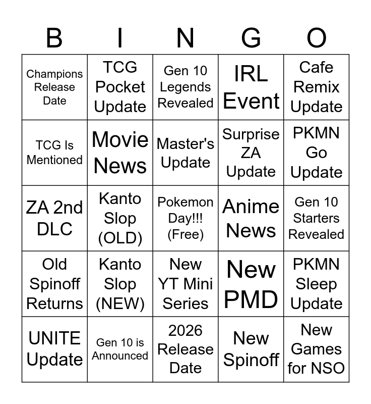 This bingo card has a free space and 24 words: Kanto Slop (NEW), Gen 10 is Announced, Master's Update, UNITE Update, Cafe Remix Update, Champions Release Date, TCG Is Mentioned, TCG Pocket Update, Anime News, New YT Mini Series, Surprise ZA Update, ZA 2nd DLC, New PMD, PKMN Sleep Update, Movie News, New Spinoff, Gen 10 Starters Revealed, Gen 10 Legends Revealed, PKMN Go Update, Kanto Slop (OLD), New Games for NSO, Old Spinoff Returns, IRL Event and 2026 Release Date.