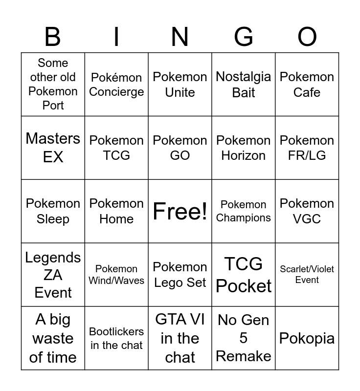 This bingo card has a free space and 24 words: Pokemon Wind/Waves, Bootlickers in the chat, Pokemon GO, A big waste of time, Pokemon Cafe, Some other old Pokemon Port, Masters EX, Pokémon Concierge, Pokemon Champions, Pokemon Lego Set, Pokemon Horizon, Pokemon Sleep, TCG Pocket, Scarlet/Violet Event, Pokemon TCG, No Gen 5 Remake, Pokemon VGC, Pokemon Unite, Pokemon FR/LG, Pokemon Home, Pokopia, Legends ZA Event, Nostalgia Bait and GTA VI in the chat.