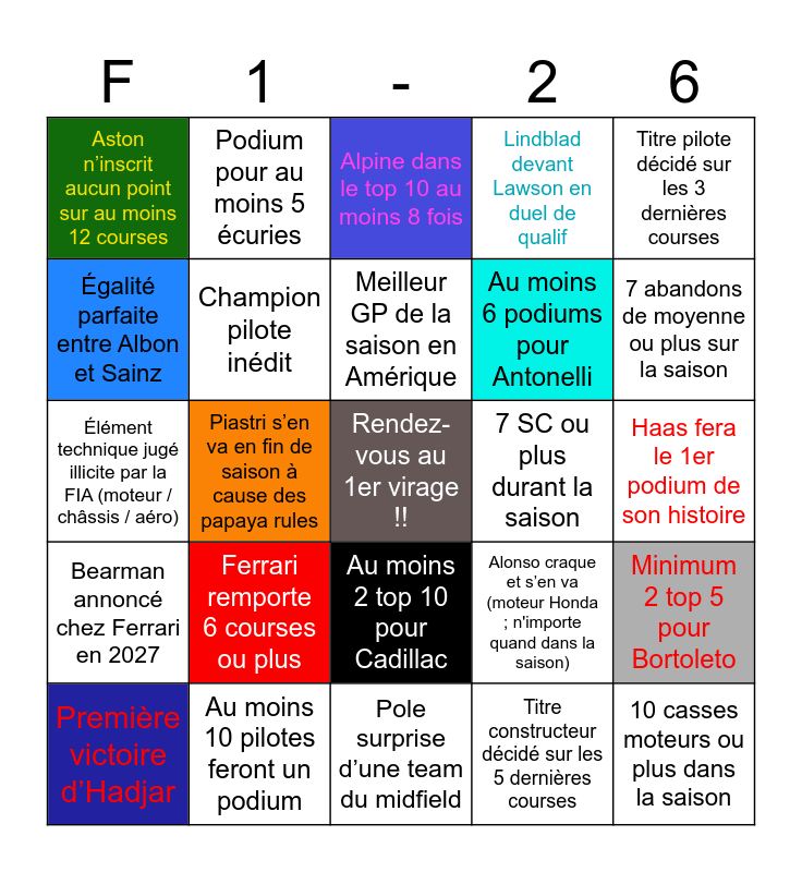 This bingo card has a free space and 24 words: Ferrari remporte 6 courses ou plus, Au moins 10 pilotes feront un podium, Meilleur GP de la saison en Amérique, Première victoire d’Hadjar, Titre pilote décidé sur les 3 dernières courses, Aston n’inscrit aucun point sur au moins 12 courses, Égalité parfaite entre Albon et Sainz, Podium pour au moins 5 écuries, 7 SC ou plus durant la saison, Au moins 2 top 10 pour Cadillac, Au moins 6 podiums pour Antonelli, Élément technique jugé illicite par la FIA (moteur / châssis / aéro), Alonso craque et s’en va (moteur Honda ; n'importe quand dans la saison), Minimum 2 top 5 pour Bortoleto, Champion pilote inédit, Titre constructeur décidé sur les 5 dernières courses, Haas fera le 1er podium de son histoire, Alpine dans le top 10 au moins 8 fois, 7 abandons de moyenne ou plus sur la saison, Piastri s’en va en fin de saison à cause des papaya rules, 10 casses moteurs ou plus dans la saison, Bearman annoncé chez Ferrari en 2027, Lindblad devant Lawson en duel de qualif and Pole surprise d’une team du midfield.