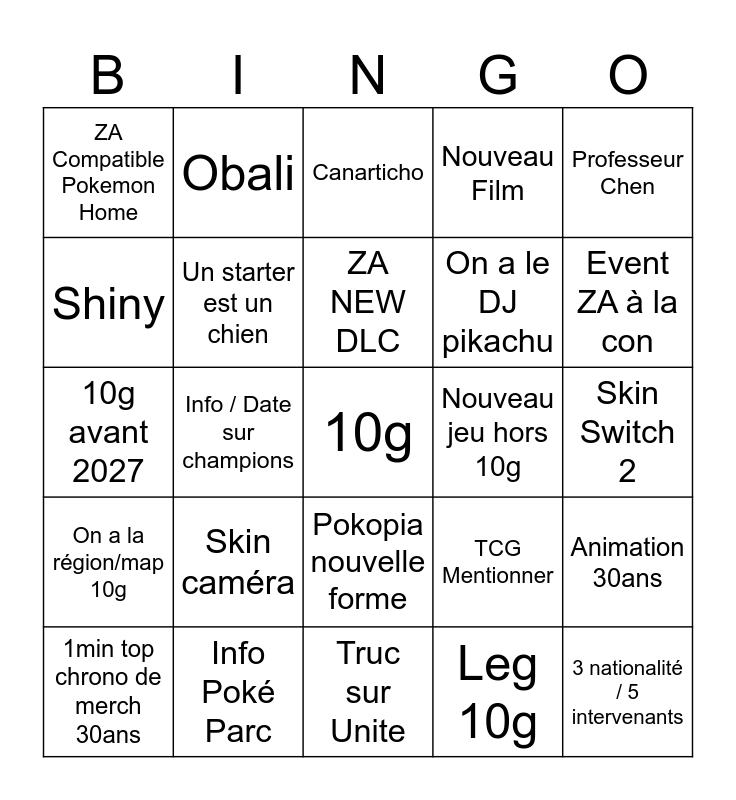 This bingo card has a free space and 24 words: Skin caméra, Info Poké Parc, ZA NEW DLC, 1min top chrono de merch 30ans, Professeur Chen, ZA Compatible Pokemon Home, Shiny, Obali, Nouveau jeu hors 10g, Pokopia nouvelle forme, On a le DJ pikachu, 10g avant 2027, TCG Mentionner, Animation 30ans, Un starter est un chien, Leg 10g, Skin Switch 2, Canarticho, Event ZA à la con, Info / Date sur champions, 3 nationalité / 5 intervenants, On a la région/map 10g, Nouveau Film and Truc sur Unite.