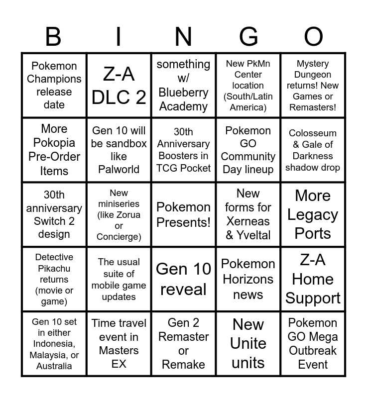 This bingo card has a free space and 24 words: The usual suite of mobile game updates, Time travel event in Masters EX, 30th Anniversary Boosters in TCG Pocket, Gen 10 set in either Indonesia, Malaysia, or Australia, Mystery Dungeon returns! New Games or Remasters!, Pokemon Champions release date, More Pokopia Pre-Order Items, Z-A DLC 2, New forms for Xerneas & Yveltal, Gen 10 reveal, Pokemon GO Community Day lineup, 30th anniversary Switch 2 design, Pokemon Horizons news, Z-A Home Support, Gen 10 will be sandbox like Palworld, New Unite units, More Legacy Ports, something w/ Blueberry Academy, Colosseum & Gale of Darkness shadow drop, New miniseries (like Zorua or Concierge), Pokemon GO Mega Outbreak Event, Detective Pikachu returns (movie or game), New PkMn Center location (South/Latin America) and Gen 2 Remaster or Remake.
