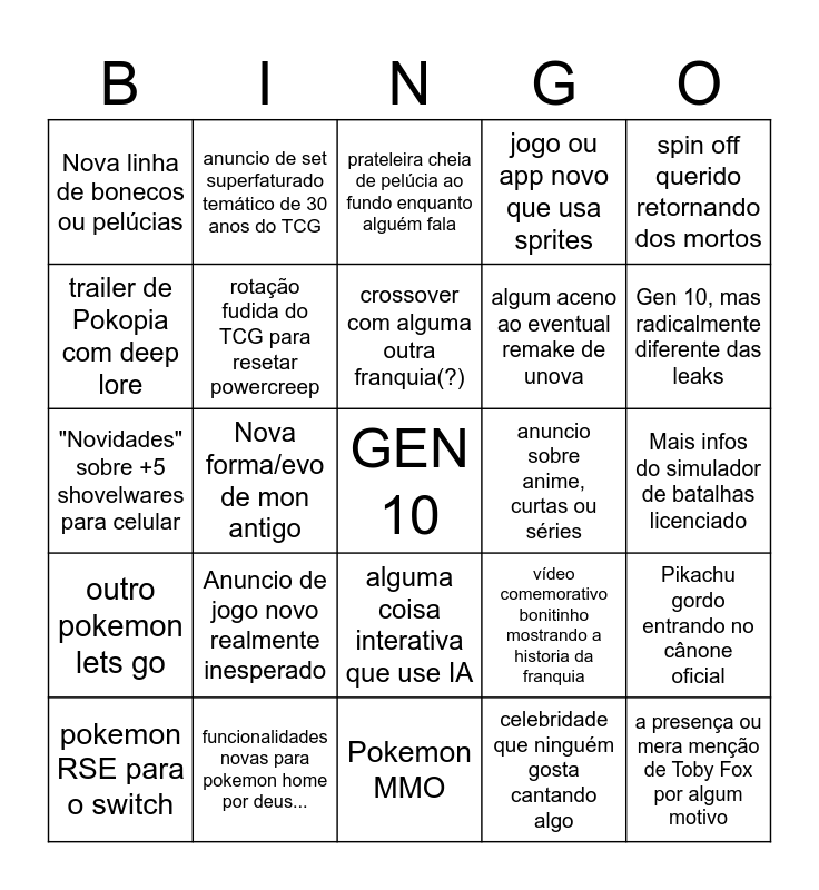 This bingo card has a free space and 24 words: Anuncio de jogo novo realmente inesperado, funcionalidades novas para pokemon home por deus..., crossover com alguma outra franquia(?), pokemon RSE para o switch, spin off querido retornando dos mortos, Nova linha de bonecos ou pelúcias, trailer de Pokopia com deep lore, anuncio de set superfaturado temático de 30 anos do TCG, anuncio sobre anime, curtas ou séries, alguma coisa interativa que use IA, algum aceno ao eventual remake de unova, "Novidades" sobre +5 shovelwares para celular, vídeo comemorativo bonitinho mostrando a historia da franquia, Pikachu gordo entrando no cânone oficial, rotação fudida do TCG para resetar powercreep, celebridade que ninguém gosta cantando algo, Mais infos do simulador de batalhas licenciado, prateleira cheia de pelúcia ao fundo enquanto alguém fala, Gen 10, mas radicalmente diferente das leaks, Nova forma/evo de mon antigo, a presença ou mera menção de Toby Fox por algum motivo, outro pokemon lets go, jogo ou app novo que usa sprites and Pokemon MMO.