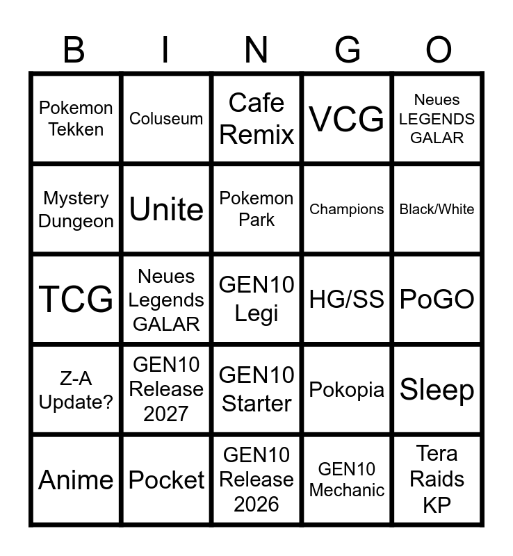 This bingo card has a free space and 24 words: GEN10 Release 2027, Pocket, Pokemon Park, Anime, Neues LEGENDS GALAR, Pokemon Tekken, Mystery Dungeon, Coluseum, HG/SS, GEN10 Starter, Champions, TCG, Pokopia, Sleep, Unite, GEN10 Mechanic, PoGO, Cafe Remix, Black/White, Neues Legends GALAR, Tera Raids KP, Z-A Update?, VCG and GEN10 Release 2026.