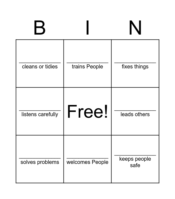 This bingo card has a free space and 16 words: ______________ helps people, ______________ works in an office, ______________ fixes things, ______________ cleans or tidies, ______________ uses a computer, ______________ trains People, ______________ works in a team, ______________ talks to students about the Future, ______________ keeps people safe, ______________ leads others, ______________ is creative, ______________ listens carefully, ______________ works behind the scenes, ______________ welcomes People, ______________ solves problems and ______________ organises Events.