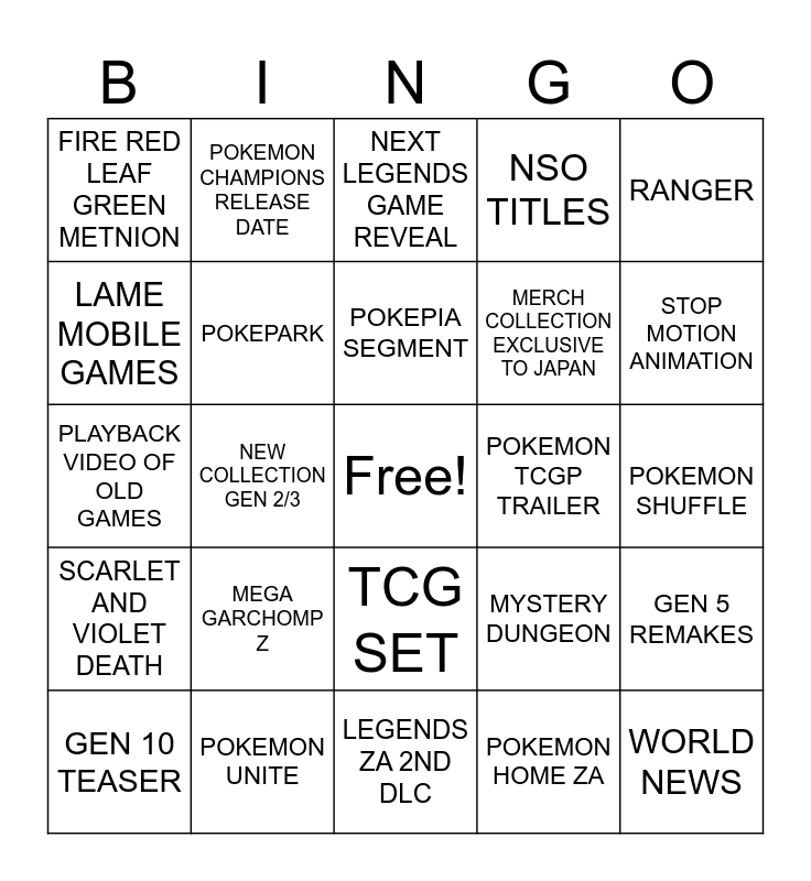 This bingo card has a free space and 24 words: MEGA GARCHOMP Z, POKEMON UNITE, POKEPIA SEGMENT, GEN 10 TEASER, RANGER, FIRE RED LEAF GREEN METNION, LAME MOBILE GAMES, POKEMON CHAMPIONS RELEASE DATE, POKEMON TCGP TRAILER, TCG SET, MERCH COLLECTION EXCLUSIVE TO JAPAN, PLAYBACK VIDEO OF OLD GAMES, MYSTERY DUNGEON, GEN 5 REMAKES, POKEPARK, POKEMON HOME ZA, POKEMON SHUFFLE, NEXT LEGENDS GAME REVEAL, STOP MOTION ANIMATION, NEW COLLECTION GEN 2/3, WORLD NEWS, SCARLET AND VIOLET DEATH, NSO TITLES and LEGENDS ZA 2ND DLC.