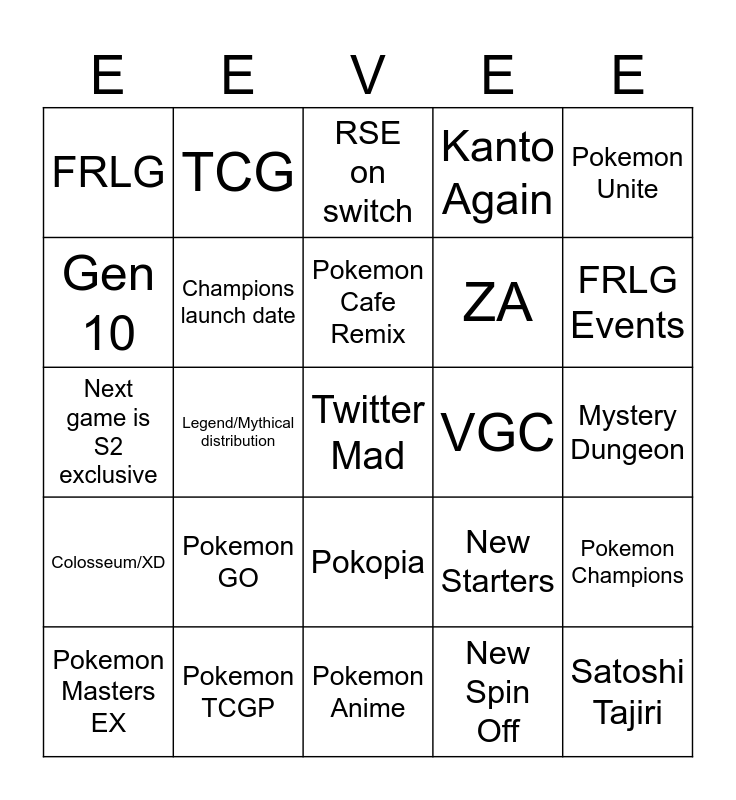 This bingo card has a free space and 24 words: Pokemon GO, Pokemon TCGP, Pokemon Cafe Remix, Pokemon Masters EX, Pokemon Unite, FRLG, Gen 10, TCG, VGC, Pokopia, ZA, Next game is S2 exclusive, New Starters, Pokemon Champions, Champions launch date, New Spin Off, Mystery Dungeon, RSE on switch, FRLG Events, Legend/Mythical distribution, Satoshi Tajiri, Colosseum/XD, Kanto Again and Pokemon Anime.