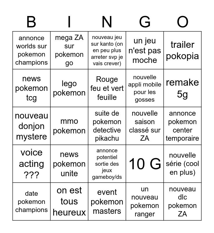 This bingo card has 25 words: news pokemon unite, event pokemon masters, Rouge feu et vert feuille, date pokemon champions, trailer pokopia, annonce worlds sur pokemon champions, news pokemon tcg, mega ZA sur pokemon go, nouvelle saison classé sur ZA, annonce potentiel sortie des jeux gameboy/ds, nouvelle appli mobile pour les gosses, nouveau donjon mystere, 10 G, nouvelle série (cool en plus), lego pokemon, nouveau dlc pokemon ZA, annonce pokemon center temporaire, nouveau jeu sur kanto (on en peu plus arreter svp je vais crever), remake 5g, mmo pokemon, suite de pokemon detective pikachu, on est tous heureux, voice acting ???, un jeu n'est pas moche and un nouveau pokemon ranger.