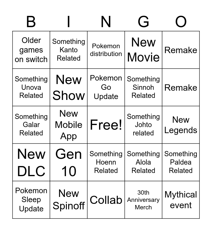 This bingo card has a free space and 24 words: Gen 10, New Spinoff, Pokemon Go Update, Pokemon Sleep Update, Remake, Older games on switch, Something Unova Related, Something Kanto Related, Something Johto related, Something Hoenn Related, Something Sinnoh Related, Something Galar Related, Something Alola Related, Something Paldea Related, New Show, 30th Anniversary Merch, New Legends, Pokemon distribution, Remake, New Mobile App, Mythical event, New DLC, New Movie and Collab.