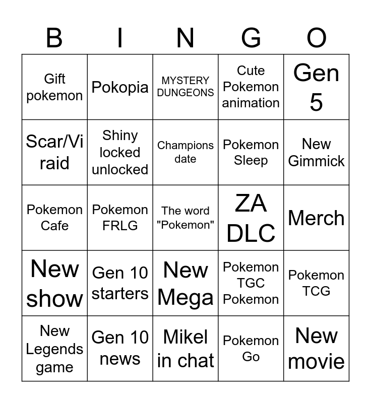 This bingo card has a free space and 24 words: Gen 10 starters, Gen 10 news, Champions date, New Legends game, Gen 5, Gift pokemon, Scar/Vi raid, Pokopia, ZA DLC, New Mega, Pokemon Sleep, Pokemon Cafe, Pokemon TGC Pokemon, Pokemon TCG, Shiny locked unlocked, Pokemon Go, Merch, MYSTERY DUNGEONS, New Gimmick, Pokemon FRLG, New movie, New show, Cute Pokemon animation and Mikel in chat.