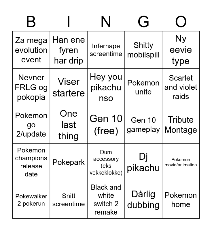 This bingo card has a free space and 24 words: Pokepark, Snitt screentime, Hey you pikachu nso, Pokewalker 2 pokerun, Ny eevie type, Za mega evolution event, Nevner FRLG og pokopia, Han ene fyren har drip, Gen 10 gameplay, Dum accessory (eks vekkeklokke), Pokemon unite, Pokemon go 2/update, Dj pikachu, Pokemon movie/animation, Viser startere, Dårlig dubbing, Tribute Montage, Infernape screentime, Scarlet and violet raids, One last thing, Pokemon home, Pokemon champions release date, Shitty mobilspill and Black and white switch 2 remake.