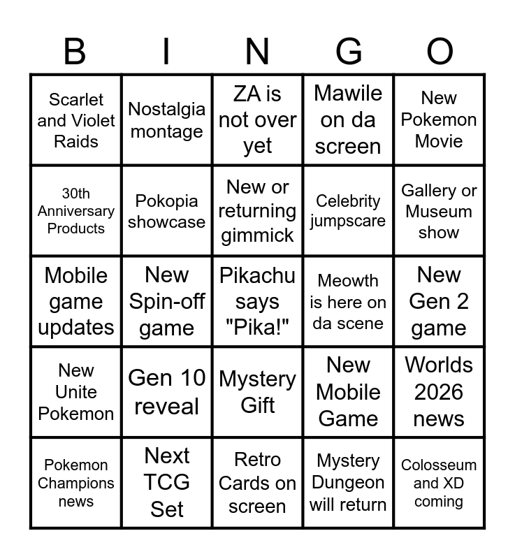 This bingo card has a free space and 24 words: Gen 10 reveal, Next TCG Set, New or returning gimmick, Pokemon Champions news, New Pokemon Movie, Scarlet and Violet Raids, 30th Anniversary Products, Nostalgia montage, Meowth is here on da scene, Mystery Gift, Celebrity jumpscare, Mobile game updates, New Mobile Game, Worlds 2026 news, Pokopia showcase, Mystery Dungeon will return, New Gen 2 game, ZA is not over yet, Gallery or Museum show, New Spin-off game, Colosseum and XD coming, New Unite Pokemon, Mawile on da screen and Retro Cards on screen.