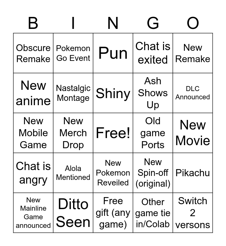 This bingo card has a free space and 24 words: Alola Mentioned, Ditto Seen, Shiny, New Mainline Game announced, New Remake, Obscure Remake, New anime, Pokemon Go Event, Old game Ports, New Pokemon Reveiled, Ash Shows Up, New Mobile Game, New Spin-off (original), Pikachu, Nastalgic Montage, Other game tie in/Colab, New Movie, Pun, DLC Announced, New Merch Drop, Switch 2 versons, Chat is angry, Chat is exited and Free gift (any game).