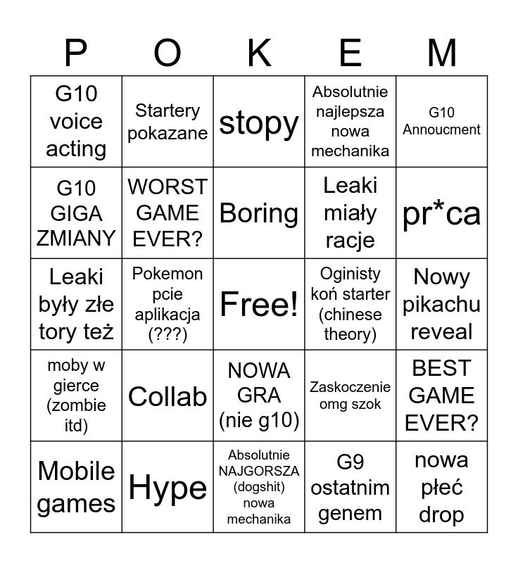 This bingo card has a free space and 24 words: Collab, Hype, Boring, Mobile games, G10 Annoucment, G10 voice acting, G10 GIGA ZMIANY, Startery pokazane, Oginisty koń starter (chinese theory), NOWA GRA (nie g10), Leaki miały racje, Leaki były złe tory też, Zaskoczenie omg szok, BEST GAME EVER?, WORST GAME EVER?, G9 ostatnim genem, Nowy pikachu reveal, stopy, pr*ca, Pokemon pcie aplikacja (???), nowa płeć drop, moby w gierce (zombie itd), Absolutnie najlepsza nowa mechanika and Absolutnie NAJGORSZA (dogshit) nowa mechanika.