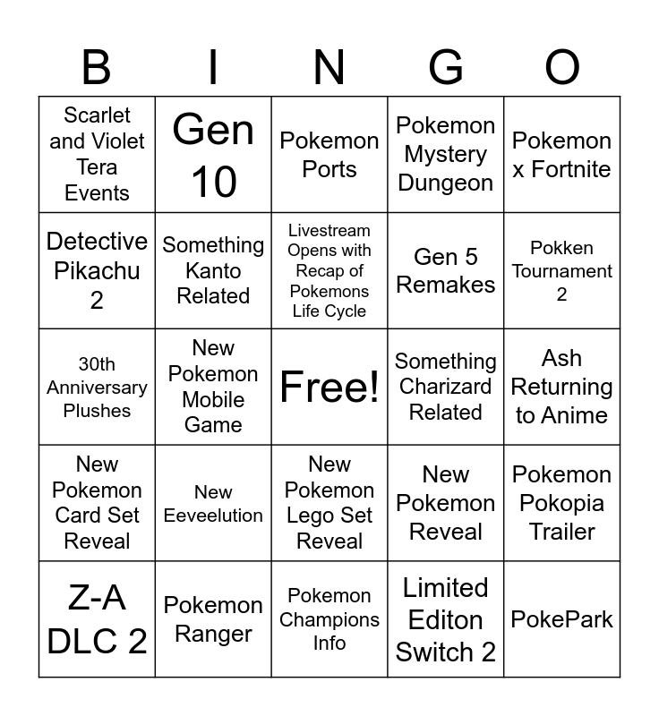This bingo card has a free space and 24 words: New Eeveelution, Pokemon Ranger, Livestream Opens with Recap of Pokemons Life Cycle, Z-A DLC 2, Pokemon x Fortnite, Scarlet and Violet Tera Events, Detective Pikachu 2, Gen 10, Something Charizard Related, New Pokemon Lego Set Reveal, Gen 5 Remakes, 30th Anniversary Plushes, New Pokemon Reveal, Pokemon Pokopia Trailer, Something Kanto Related, Limited Editon Switch 2, Ash Returning to Anime, Pokemon Ports, Pokken Tournament 2, New Pokemon Mobile Game, PokePark, New Pokemon Card Set Reveal, Pokemon Mystery Dungeon and Pokemon Champions Info.